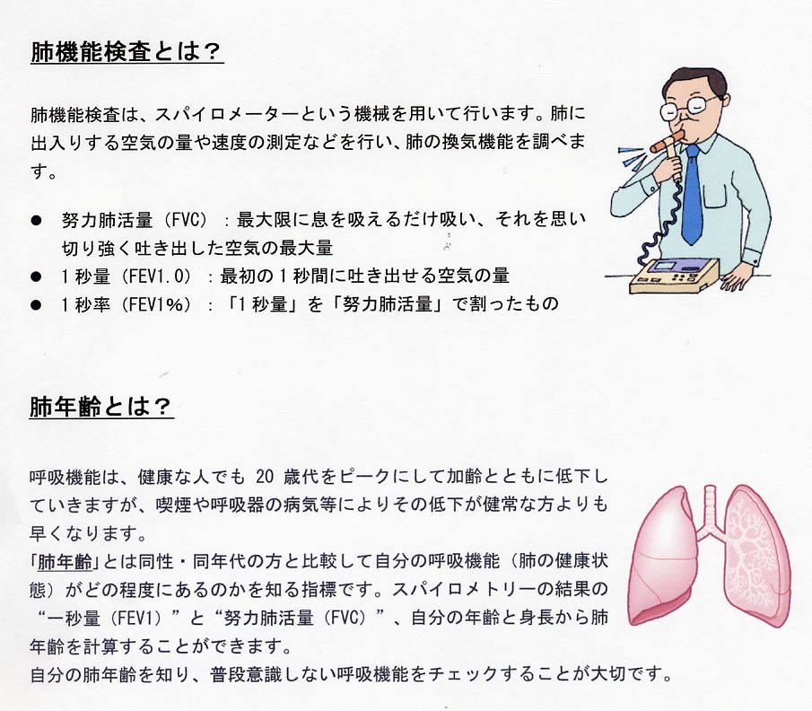 本日から、城北診療所で呼吸機能検査をすると、肺年齢を表示できるようになりました。血管年齢とか骨年齢とか色々言われてきておりますが、肺年齢も今後調べるようになさって下さい。その解説をしばらく続けます。