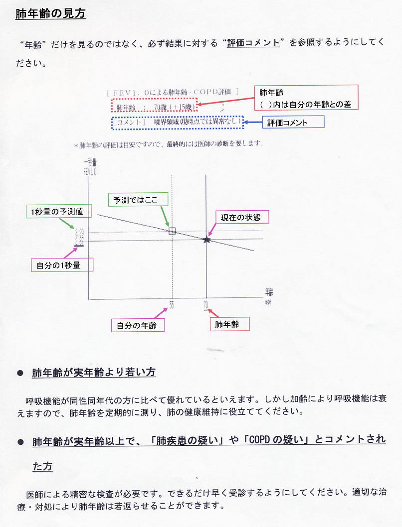 これが肺年齢を表示する検査結果です。プロットされてきますので、ピークフロー値をつけている喘息日誌にはさんでおくとよいでしょう。だんだんと改善して行くことを楽しみにすることが出来ます。昨日も3人ほど実施しました。肺年齢が95歳という人がまた出て、びっくりしておられました。