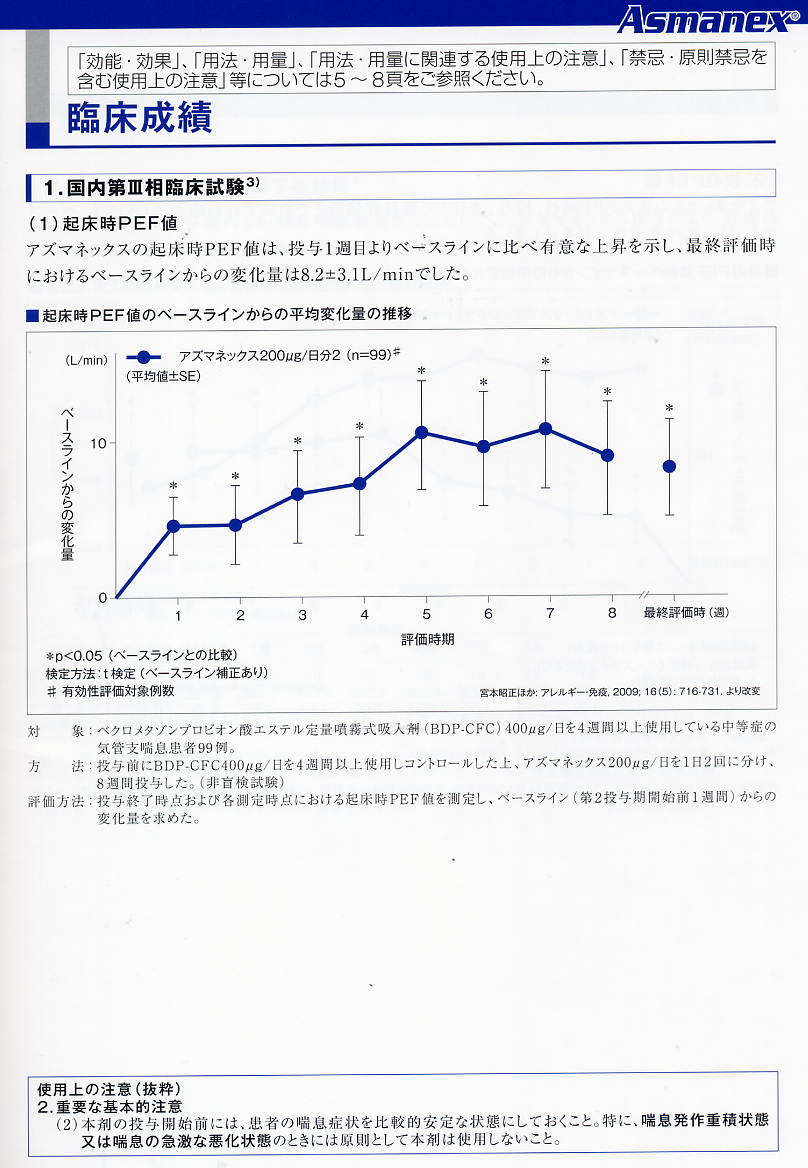 臨床成績です。起床時ピークフロー値の推移を示しています。