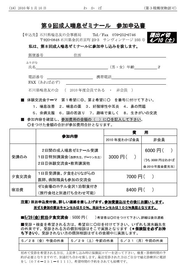 第9回成人喘息ゼミナールの申込書です。4月10日が締め切り日です。現在のところ、約30名がすでに申し込んでおられます。定員目安は70名ですので、申し込まれる方は早めにお申し込み下さい。わかば会員に限っては今年度は参加費3000円で、1泊2日の特別講演聴講・その他の講演や行事・受講がすべて可能です。