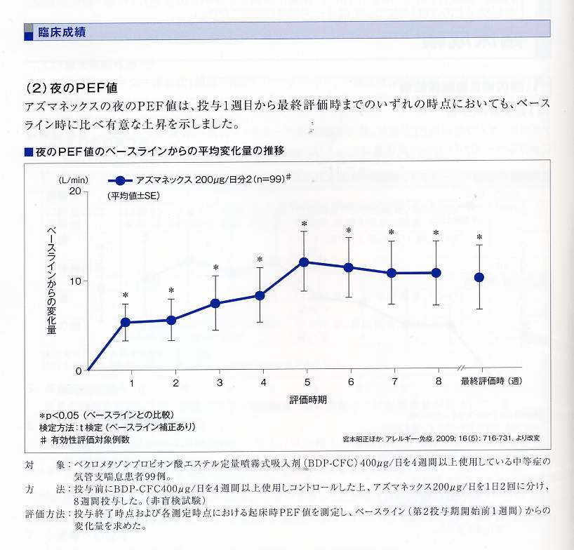 朝のピークフロー値の推移で効果を見るのが普通ですが、このデータは夜のピークフロー値で効果の推移を見ております。