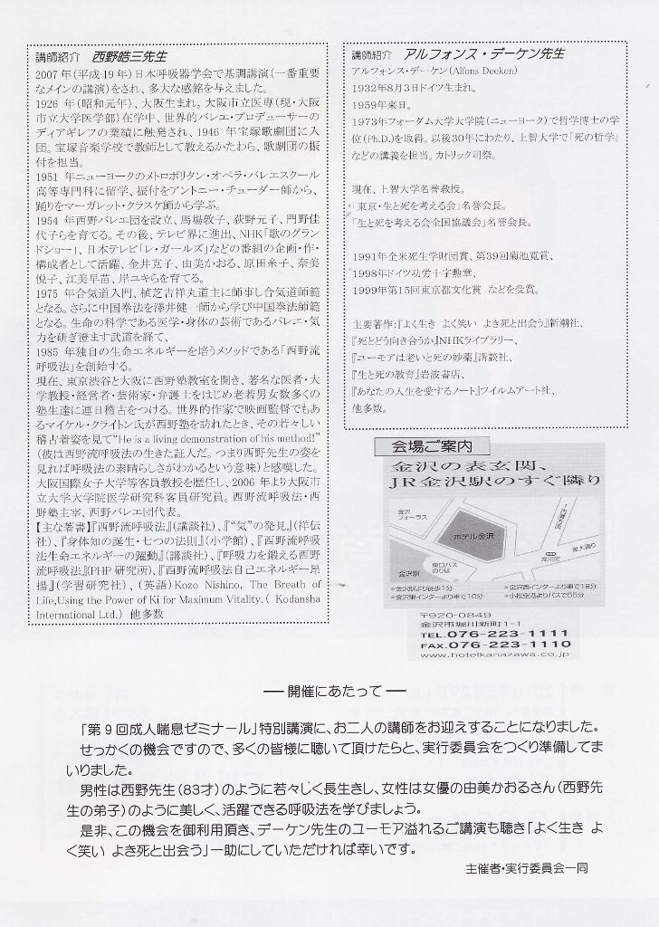 昨日のチラシの裏側です。西野先生、デーケン先生とはどういう先生か、紹介が掲載されております。会場となる場所・ホテル[:ビル:]は金沢駅のすぐ近くです。実行委員会の開催にあたっての「呼びかけ」も一番下にあります。