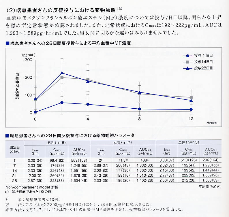 アズマネックスの反復投与結果の血中濃度のデータです。これがより重要と言えましょう。1回投与よりは血中濃度が上がっています。しかし過剰に上がりすぎるということは無いようです。