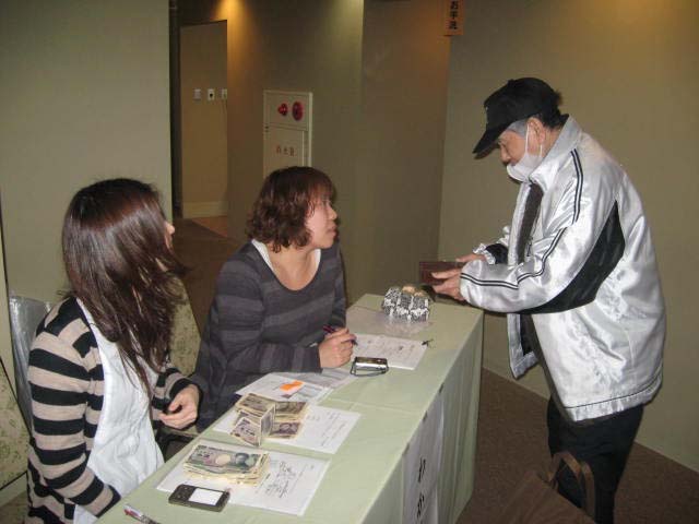 写真は参加者の受付風景から始まります。会員さんは重装備ですね。寒かったし、風邪を引かないようにということでありましょう。