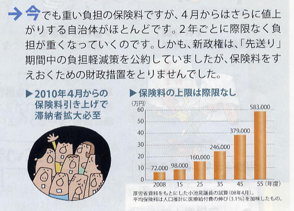 後期高齢者医療保険の保険料は年金から天引きされたり、自分で納めるようになっておりますが、高額のために払えないという人がいたり、生活が苦しくなったという人があとを絶ちません。今年4月からは、もっと引き上げる自治体が増えると予想されております。そしてこのままでは、うなぎ登りに上昇することが予測されています。グラフをご覧下さい。