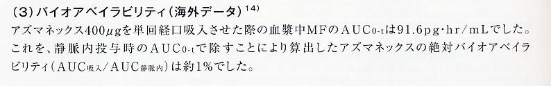 アズマネックスの単回吸入によって血液中に吸収される量は、同じ濃度のものを静脈注射で投与した場合の1%に過ぎないことが紹介されています。難しい言葉によって表現されていますが、言わんとすることはそういうことです。私の解説も役立つということですね。
