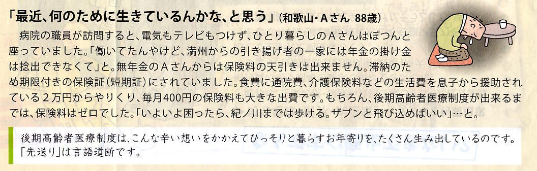 以下のようなお年寄りは多くなっております。私も家庭訪問をして、電気もストーブもこたつもせず、たくさんの布団を積み上げて、その中で寝て居られるお年寄りに出会いました。出費を極力抑えているのだそうです。