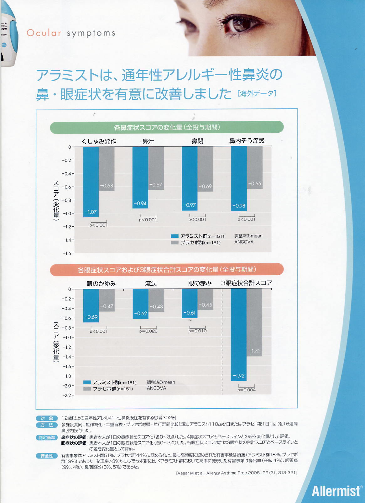 通年性アレルギー性鼻炎の鼻と目の症状を改善させたというデーターです。特に目の症状を改善させるというデーターは、これまでの鼻噴霧薬にはないものです。