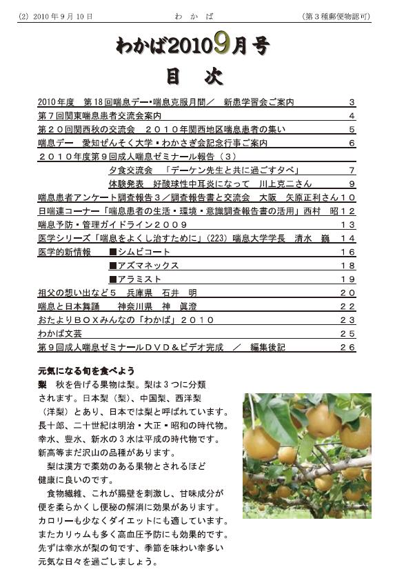 2ページ目です。目次と季節の果物(梨)について紹介されています。これらの中身を入手したいと思われる方は、わかば会に入会されて会報をお読み下さい、