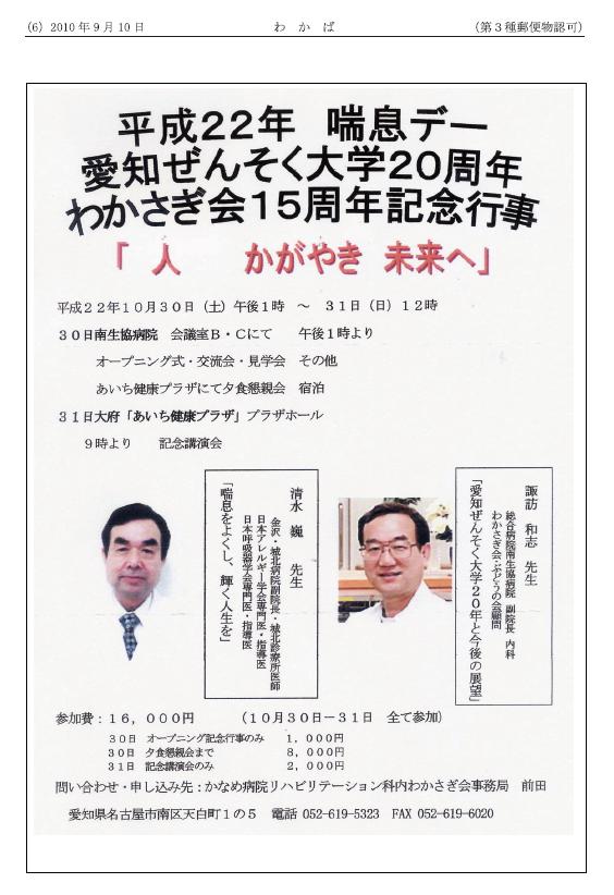 6ページ目は「平成22年 喘息デー 愛知ぜんそく大学20周年 わかさぎ会15周年記念行事・・・人 かがやき 未来へ」という東海地方の講演会と交流会の案内が掲載されております。