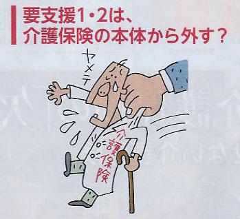 要支援1.2の軽度の人を、介護保険本体の対象から外すなどということが、議論されております。風邪など軽い病気の場合は、医療保険の対象から外すというような考え方と一緒です。