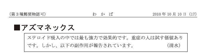 ドライパウダーのステロイド吸入剤の中では、最も粒子が細かいとされております。ステロイド単独吸入剤の中では最も強力なステロイド吸入剤と私は考えておりますが、薬は両刃の剣、副作用は明記しなければなりません。