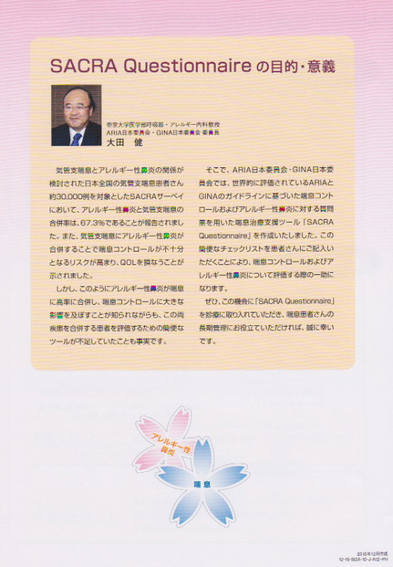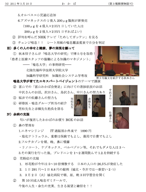 わかば3月号4/喘息とアレルギー性鼻炎質問票 4/総会・新年会23 わかば3月号4 誌面の4頁目です。今年度開催されたわかば会の総会の模様が報告されております。 喘息とアレルギー性鼻炎質問票 4 掲載許可をしてくださった大田先生がこの質問票の目的と意義を語っておられます。桜がイメージとして採用されているようですね。 総会・新年会23 総会と新年会・宴会[:ラーメン:][:ジュース:]の光景です。初めてあった方同士でも、同じ喘息患者、たちまち親しくなって会話もはずみます。食事もすすみます。 FacebookTwitterGoogle+email By 清水 巍 | 2011年4月11日 | 医療 | ← わかば3月号3/喘息とアレルギー性鼻炎質問票 3/総会・新年会22 春ですね/わかば3月号5/喘息とアレルギー性鼻炎質問票 5/総会・新年会24 →