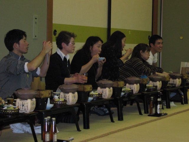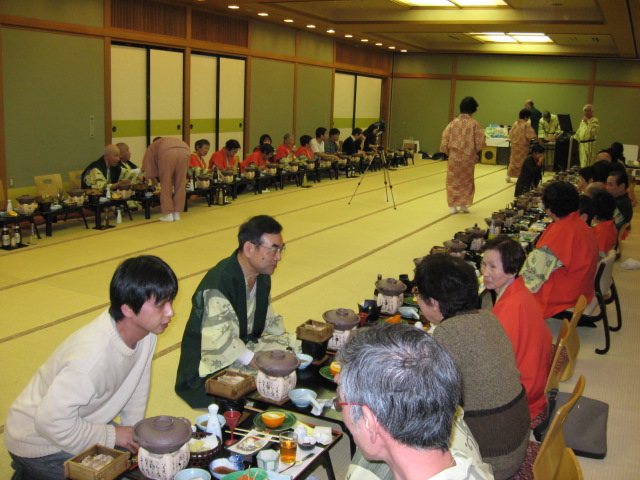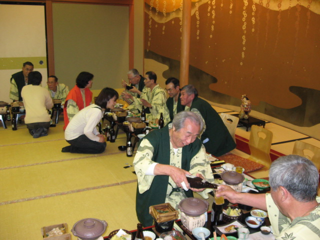 左側は事務局、看護師さんなど職員です。私も含め皆さんがお酌[:ビール:][:お酒:][:ジュース:]に回って、団欒と会話をしておられます。