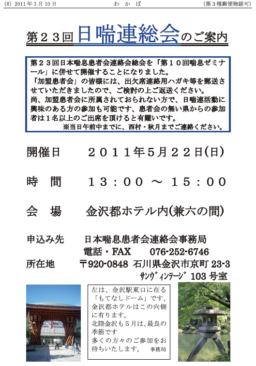 第23回日本喘息患者会連絡会総会の案内が掲示されました。東日本大震災の被害を受けた加盟患者会にも、「どのようにお見舞いを行うのか」議論される予定です。クリックして拡大してご覧になって下さい。