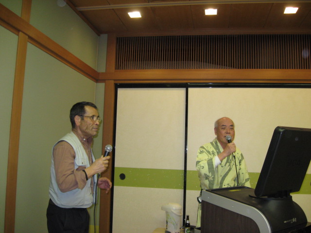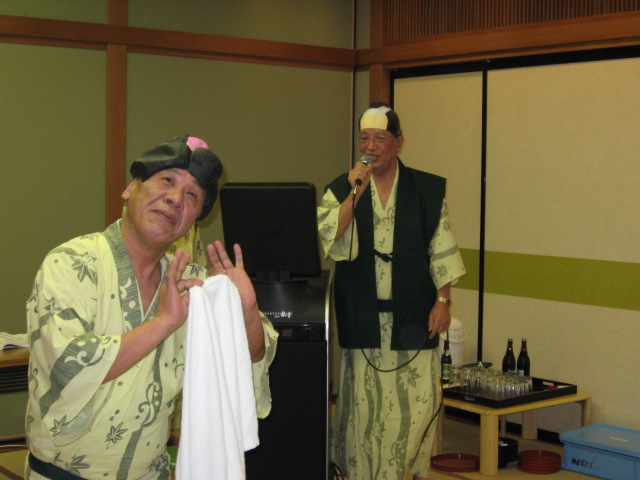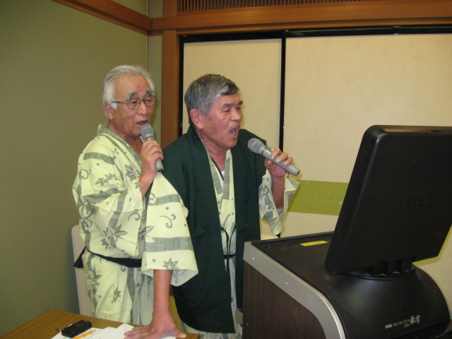 左側は、小酒さんと山本さんのデュエット[:音符:]、真ん中は北島さんの歌[:音符:]とそれに合わせて踊る石崎さんの踊り(以前に日本舞踊を習ったそうで、色っぽくて拍手喝采!評判を呼びました)、右側は加南支部お二人のデュエット[:音符:]です。