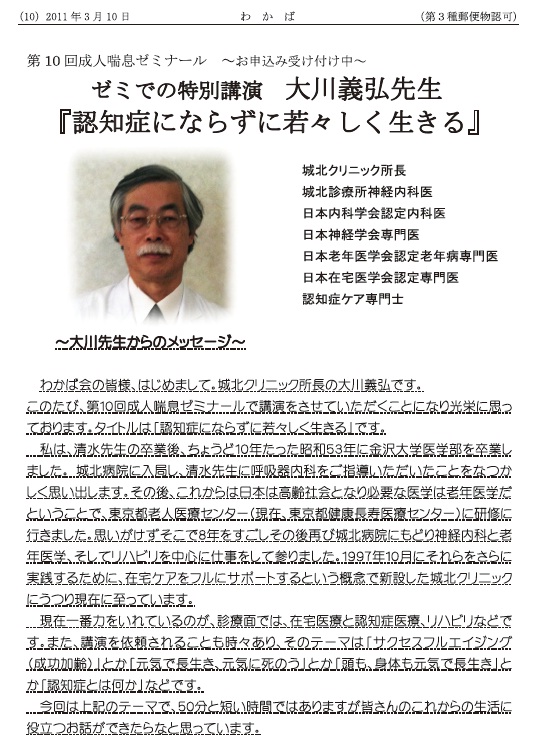 第10回成人喘息ゼミナールの目玉の一つ特別講演・大川義弘先生の「認知症にならずに、若々しく生きる」の案内が掲載されました。この講演だけでも「ぜひともお聞きしたい」と富山県高岡市から、ゼミ参加を申し込まれた人もおられます。