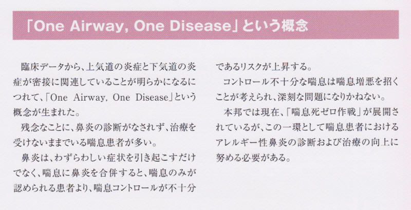 ワン・ウエイ ワン・ディズィーズという言葉は良く使われるようになってきました。鼻と気道は1本の道であり、一つの同じ疾患と考えなければならないという意味です。