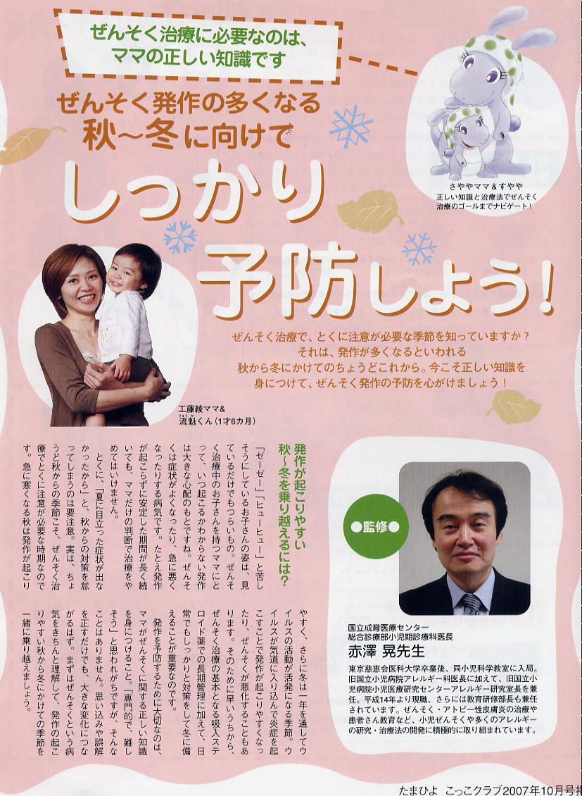 アストラゼネカ社からホームページで公開して下さってもよいですよと提供を受けた「小児喘息向けパンフレット」であります。寒くなってきて、小児・成人とも、喘息発作が多発してきております。昨日の外来では8人もの新患の喘息患者さんが、私の外来に来られました。沖縄から来られた人もいます。