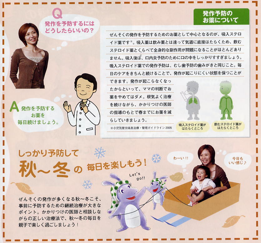 しっかり予防しよう 4 子どもさんにステロイド吸入薬を投与するのは恐いと思っていらっしゃるご家族にとっては、参考となる解説です。秋は喘息発作が多発する期間です。その間ぐらいは決められた量のステロイド吸入薬を投与しても、ウガイの励行、食前の吸入を思うならば、副作用を心配する必要は無いでしょう。この解説では春までステロイド吸入は続けるべきだ、春になったら減らしましょうという解説でありますが、冬になって良くなれば、減らしたり、中止したりすることが可能になるお子さんもいらっしゃると思います。 FacebookTwitterGoogle+email By 清水 巍 | 2007年11月4日 | 医療 | ← 2007北陸3県喘息交流会25 呼吸器疾患研究会・発表内容 10 →