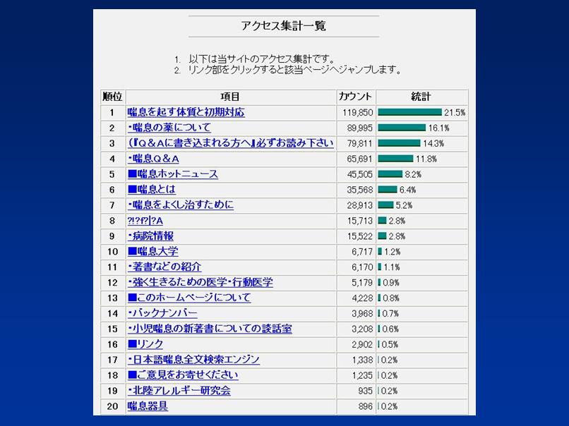 呼吸器疾患研究会・発表内容 10 これは山形で開催された全日本民医連呼吸器疾患研究会の発表で紹介させていただいた、今年10月のある日のアクセスカウンター記録です。喘息を克服するためのHPですの表紙にアクセスされた方が、そこから私たちのHPのどこかへ移動した場合のカウンター数です。お気に入りから飛んで来た場合はここにカウントされません。 基本的なところに、アクセスされることがうかがえます。ということは、基本的な内容のところに興味が集中しておられるということです。 FacebookTwitterGoogle+email By 清水 巍 | 2007年11月4日 | 医療 | ← しっかり予防しよう 4 2007北陸3県喘息交流会26 →