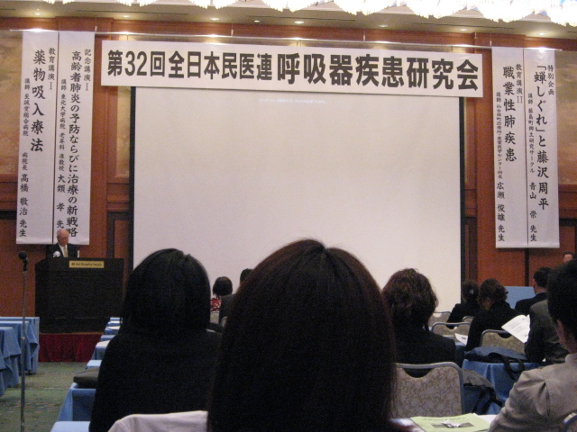 日本アレルギー学会のHPに、喘息克服月間の案内が掲載されました。これを右側の第32回全日本民医連呼吸器疾患研究会の皆さんに紹介をしたところです。この研究会は山形で行われました。