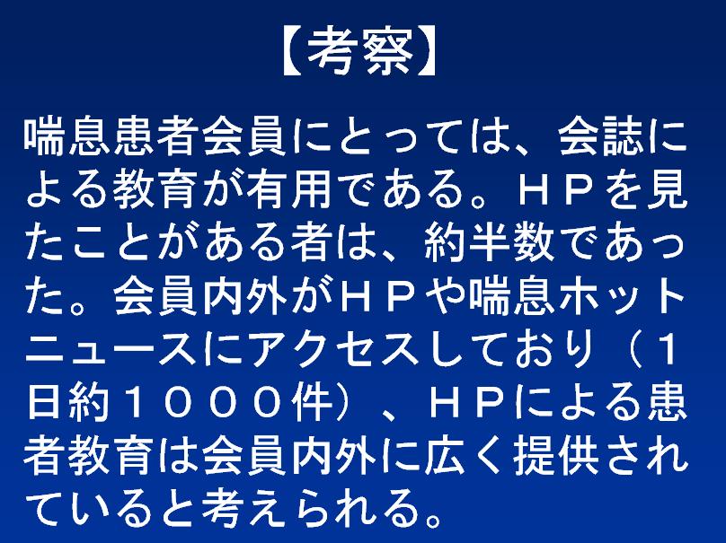 ホームページを見ることができる人にとっては、私たちのHPや喘息ホットニュースは情報提供の場として、広く役立っているものと思われます。この発表原稿を作った頃は1日1000件ほどのアクセスがあったのですが、今は低下しています。