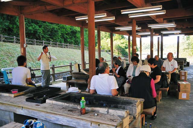 私の挨拶と9月の講座です。緑をバックに屋根の下で行われております。