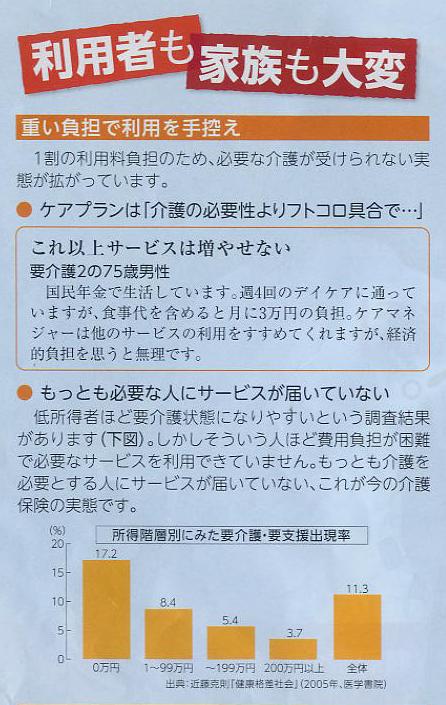10年前に介護保険料の徴収を開始し、始めるときは何でもかなうような宣伝がされたのですが、国の負担が少ないため現在では、利用者も家族も大変である実態が紹介されています。